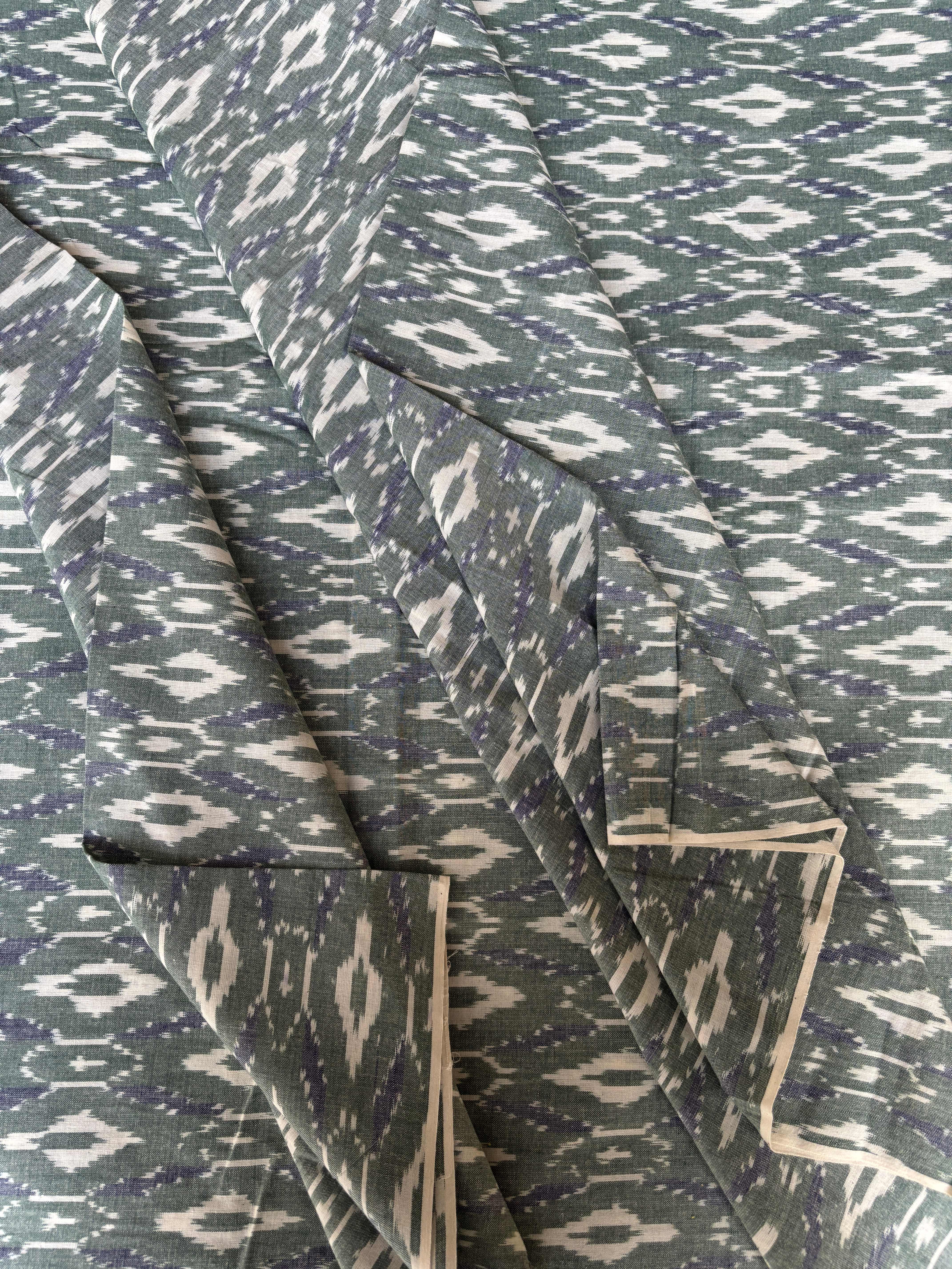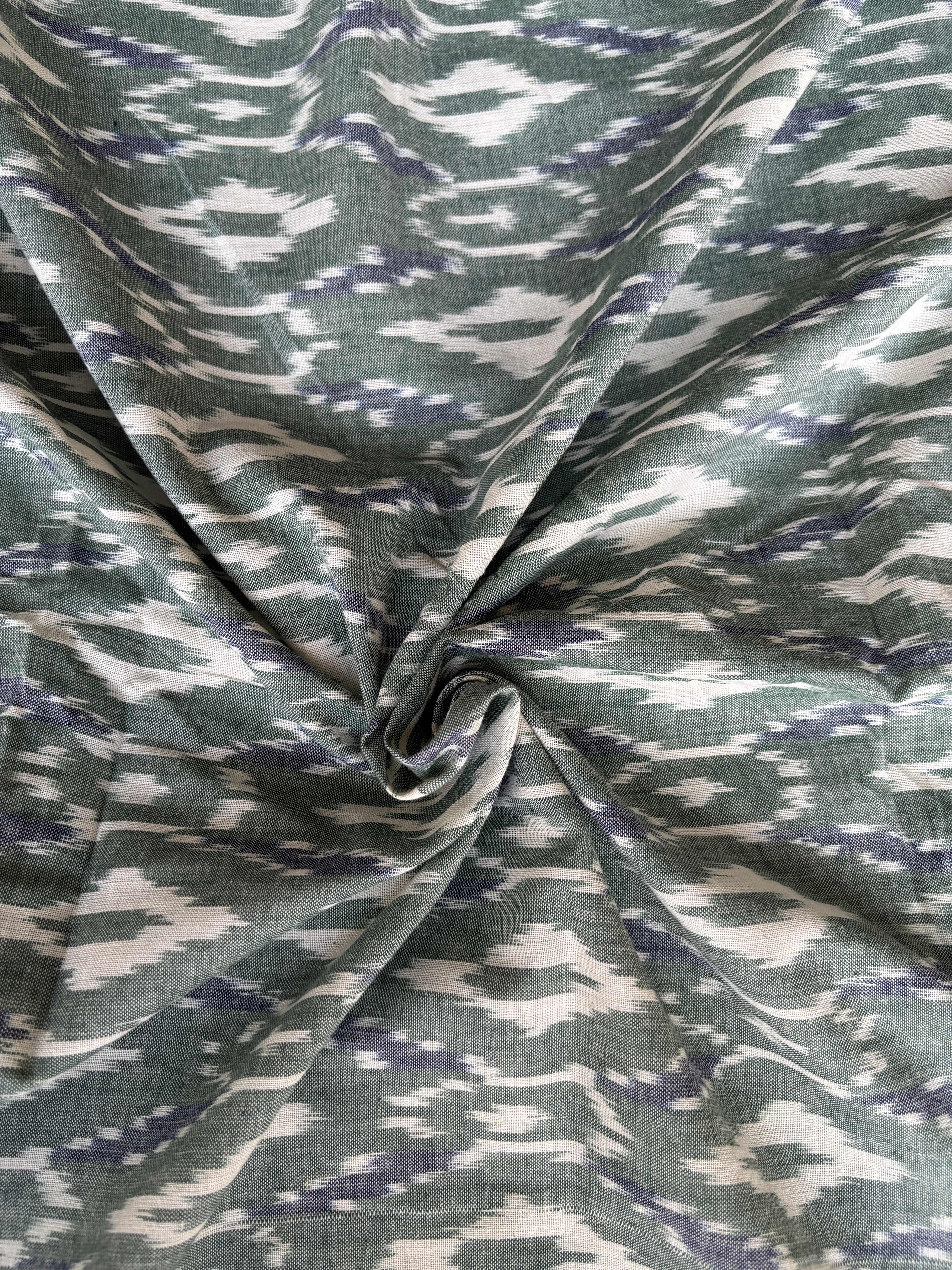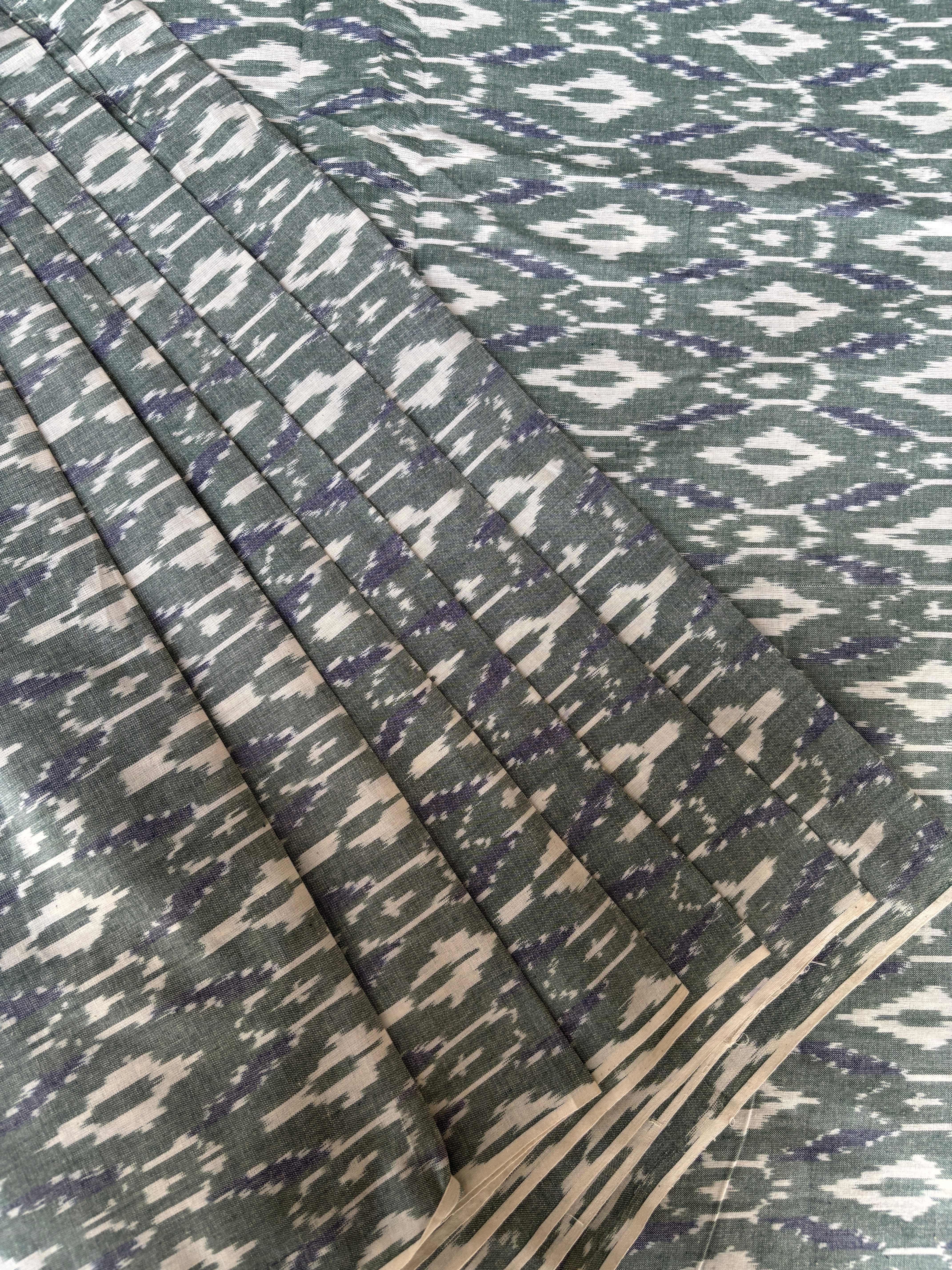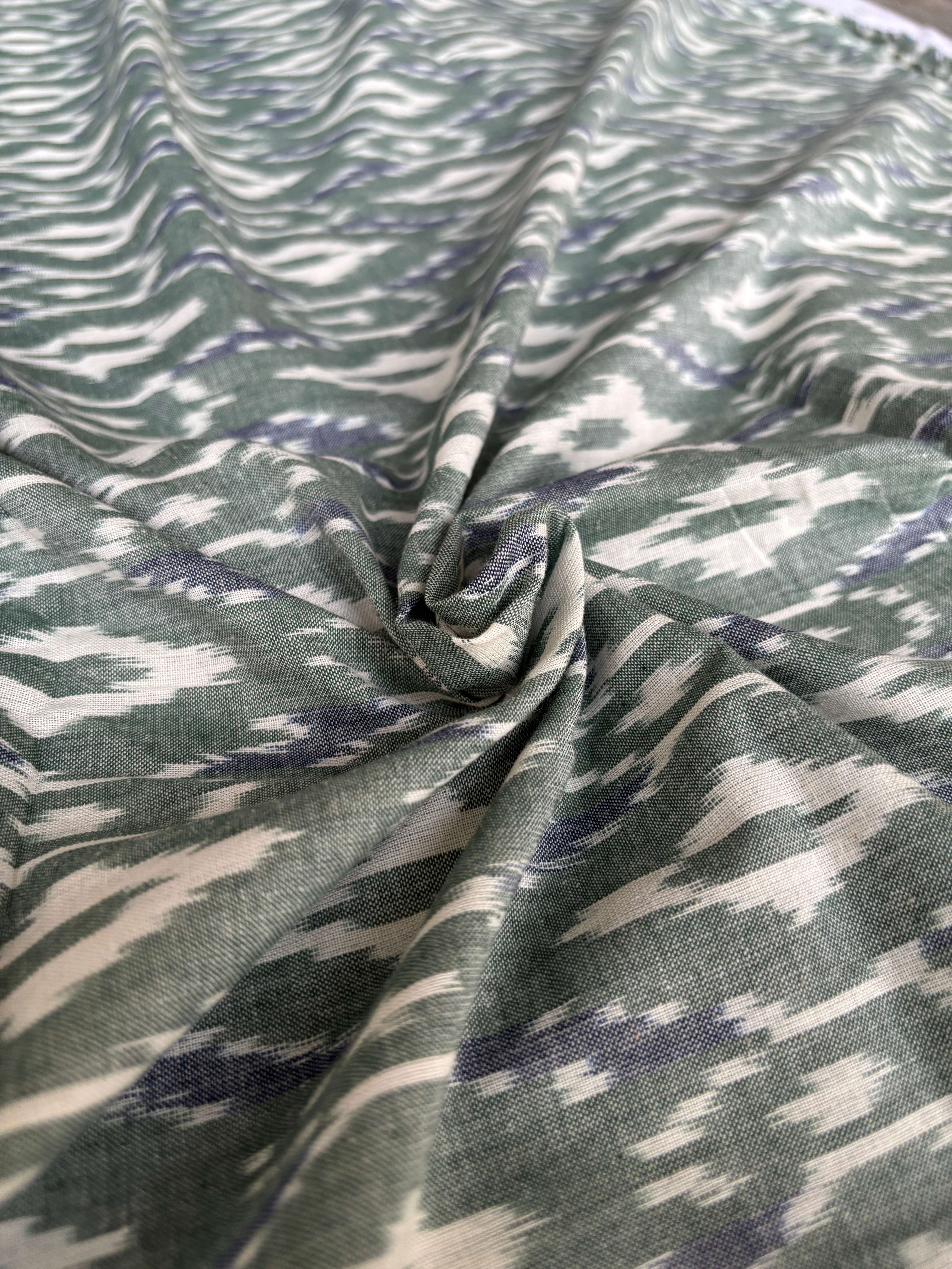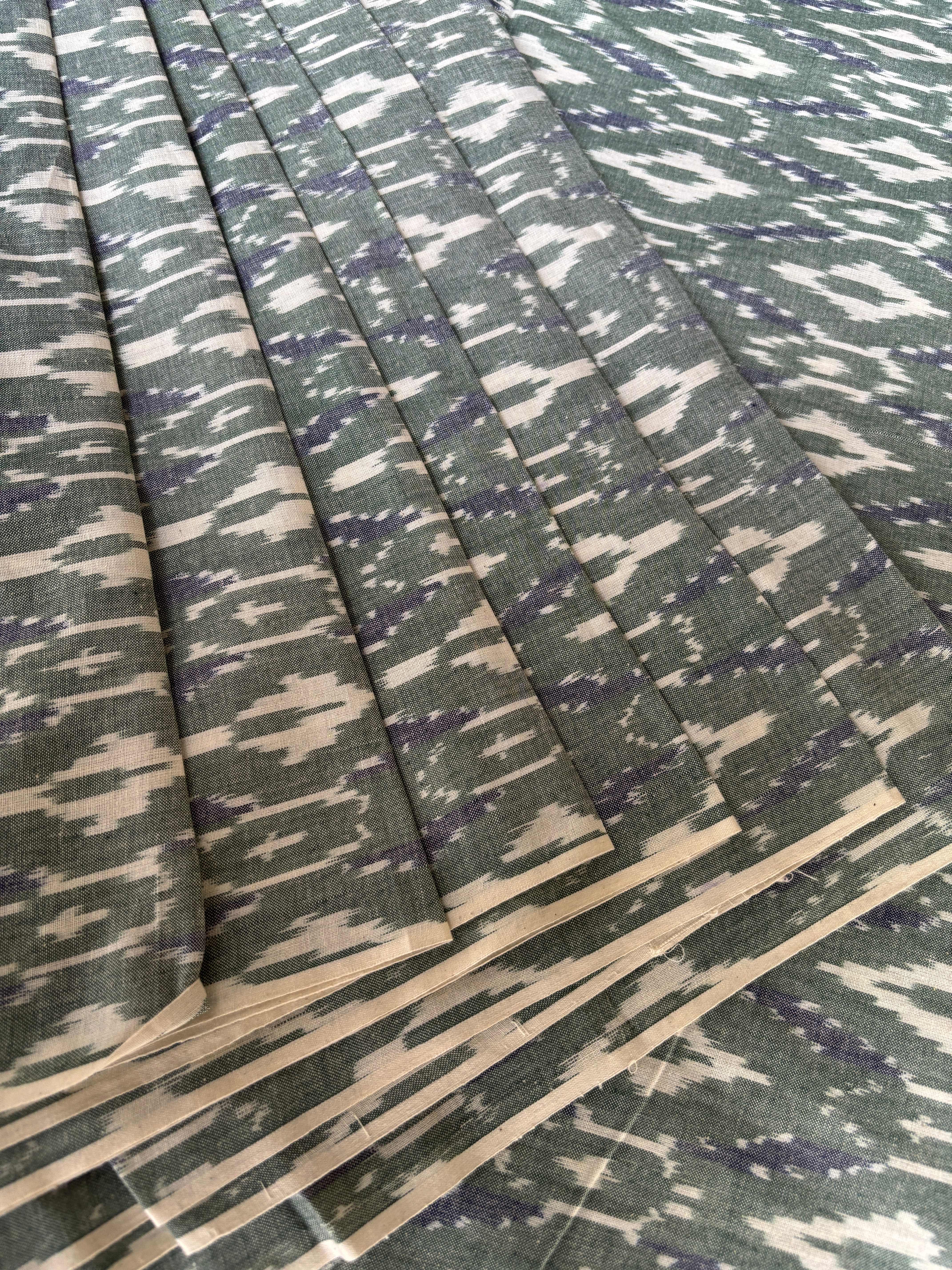Cotton Single Ikat Fabric – Pista Green & Grey Harmony,Fresh and soothing, this cotton single ikat fabric features a beautiful pista green and grey combination that blends subtle elegance with handcrafted charm. Lightweight and breathable, it’s perfect for everyday wear, dresses, kurtas, or coordinated sets. A timeless weave that brings together comfort, style, and artisanal detail.